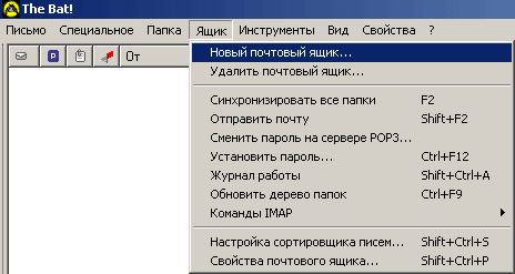 Шаг 1: Начальным этапом настройки программы The Bat! является создание нового почтового ящика. Для этого необходимо выбрать в меню "Ящик" (Account), затем пункт "Новый почтовый ящик" (New).