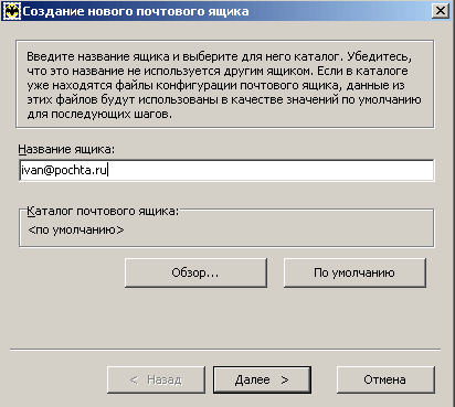 Шаг 2: Появится окно "Создание нового почтового ящика" (Create New User Account). В графе "Название ящика" (Account name) введите полный адрес Вашего почтового ящика, нажмите кнопку "Далее" (Next)