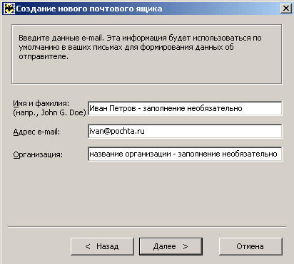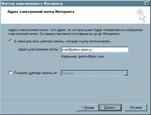 После нажатия кнопки Далее появится следующее окно, с предложением ввести название вашего электронного ящика. В строке Адрес электронной почты: следует ввести Ваш собственный электронный адрес, например: ivan@petrov.perm.ru (ivan@petrov.perm.org, ivan@petrov.perm.com), где ivan - название ящика, а petrov.perm.ru (petrov.perm.org, petrov.perm.com) - доменное имя узла (это и будет Шаг 2).