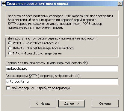 Сначала необходимо выбрать протокол (POP3), по которому будет осуществляться доступ к почтовому серверу.