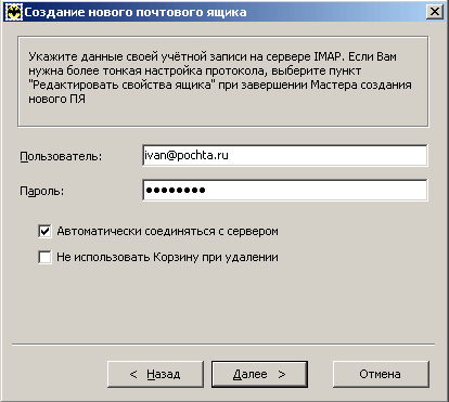 Для настройки почтогого ящика в поле Учетная запись нужно указать выданный Вам электронный адрес полностью, например: ivan@petrov.perm.ru (ivan@petrov.perm.org, ivan@petrov.perm.com), а в поле Пароль - выданный Вам пароль к этому ящику.