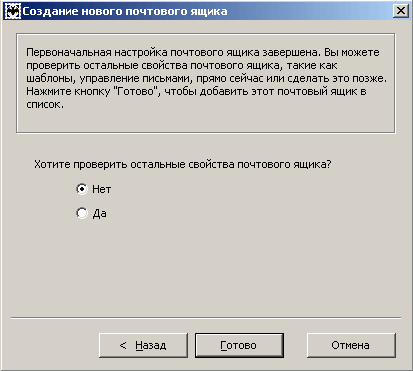 Далее у Вас появится возможность проверить остальные свойства почтового ящика. Вы можете это сделать сейчас или позже. Нажмите кнопку "Готово".