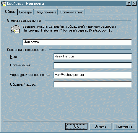 Шаг 1: На закладке Общие введите название Вашей учетной записи для удобства обращения. Введите имя или название Вашей организации. Это нужно, для того чтобы в поле письма От кого подставлялось то, что Вы введете. В строке Адрес электронной почты введите Ваш собственный электронный адрес, например: ivan@petrov.perm.ru (ivan@petrov.perm.org, ivan@petrov.perm.com), где ivan - название ящика, а petrov.perm.ru (petrov.perm.org, petrov.perm.com) - Ваш домен.