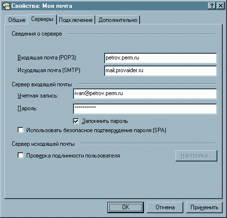 Шаг 2: Переходим на закладку Серверы. В строке Входящая почта (POP3) адрес Вашего домена (без www), например petrov.perm.ru (petrov.perm.org, petrov.perm.com). А в строке Исходящая почта (SMTP) - почтовый сервер провайдера, через которого Вы работаете, например: mail.raid.ru для Рейда, mail.permonline.ru для Пермонлайн.