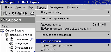 Для настройки почты запустите программу OutlookExpress. Зайдите в пункт Сервис -> Учетные записи. В появившемся окне нажмите кнопку Добавить -> Почта.