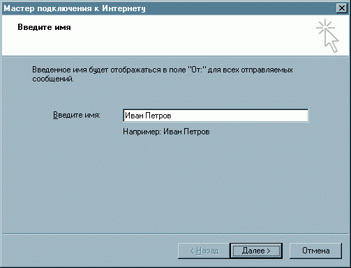 Шаг 1: Введите имя или название Вашей организации. Это нужно, для того чтобы в поле письма От кого подставлялось то что Вы введете, например Иван Петров.