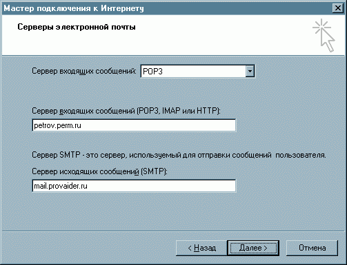 Тип сервера для входящих сообщений - POP3, далее нужно ввести адрес Вашего домена (без www), например petrov.perm.ru (petrov.perm.org, petrov.perm.com) в строке сервера для входящих сообщений. А в строке Сервер исходящих сообщений - почтовый сервер провайдера, через которого Вы работаете, например: mail.raid.ru для Рейда, mail.permonline.ru для Пермонлайн. И нажимаем кнопку далее.