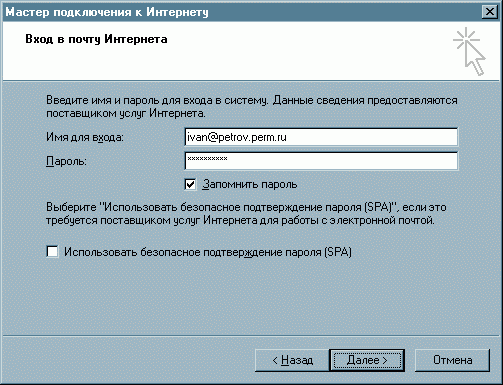 Шаг 4: Для настройки почиогого ящика в поле Имя для входа нужно указать выданный Вам электронный адрес полностью, например: ivan@petrov.perm.ru (ivan@petrov.perm.org, ivan@petrov.perm.com), а в поле Пароль - выданный Вам пароль к этому ящику.